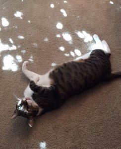 And I don’t lack for company. My three tabby cats, who normally lie around day and night, have suddenly decided they need yoga too. This is new! Mom sits on couch or lies on bed and we snuggle in close, but this body swinging and bending and legs swinging in air is too much! Must investigate. Must emulate. Underfoot, yes, but graceful.