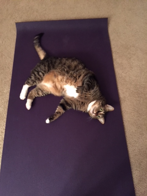 And I don’t lack for company. My three tabby cats, who normally lie around day and night, have suddenly decided they need yoga too. This is new! Mom sits on couch or lies on bed and we snuggle in close, but this body swinging and bending and legs swinging in air is too much! Must investigate. Must emulate. Underfoot, yes, but graceful.