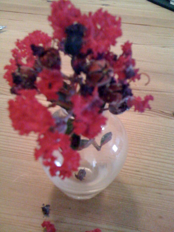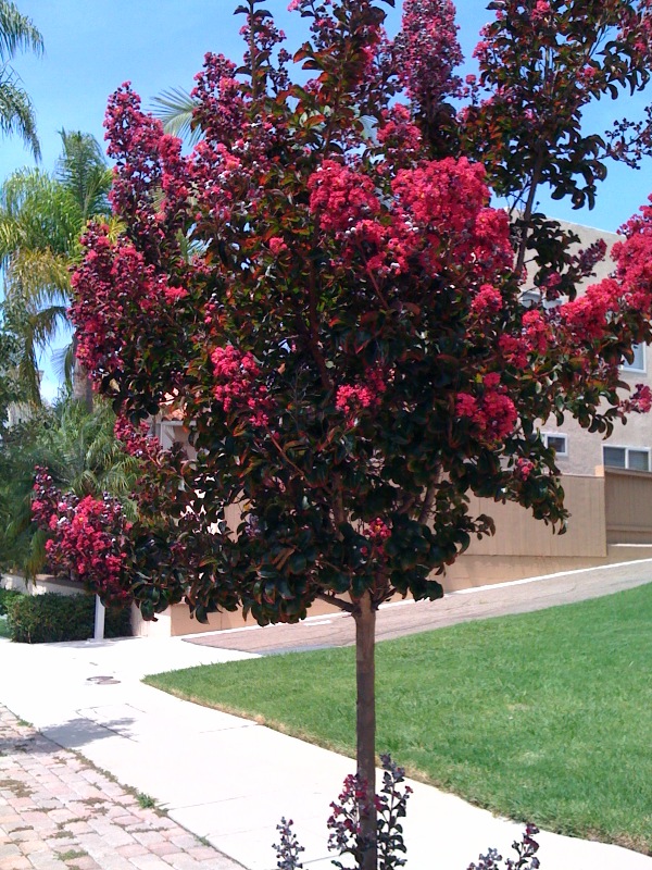 According to the cute guy at the nursery (a bonus for my visit), the tree is a crape myrtle, also known in more recent years as crepe myrtle. It is an evergreen shrub, drought resistant, and often used along our San Diego sidewalks. It does well in all warmer climates around the world, having come originally from Southeast Asia. It can grow up to 25 feet tall and even taller and
