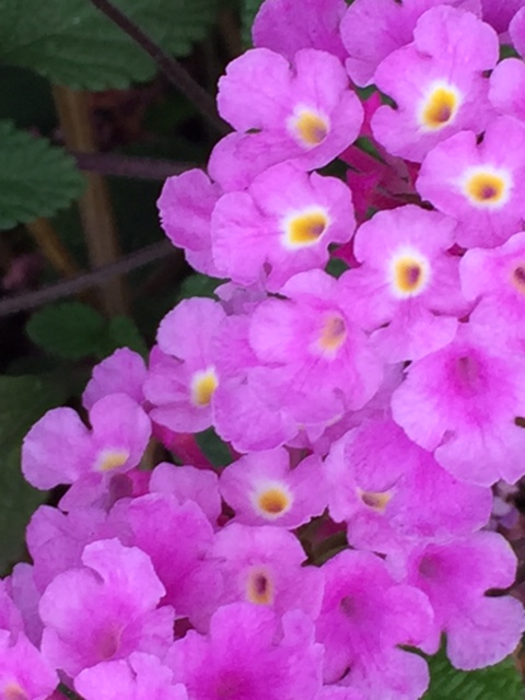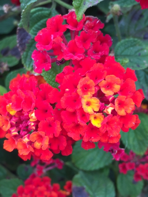 Every lantana flower head looks like a little bouquet. They smile in single colors (yellow, orange, pink, cream) or in combinations (magenta and yellow, purple and yellow, orange and yellow). One multi-colored variation called Carnival includes blossoms that are pink, red, lavender and yellow – all in one little bouquet.
